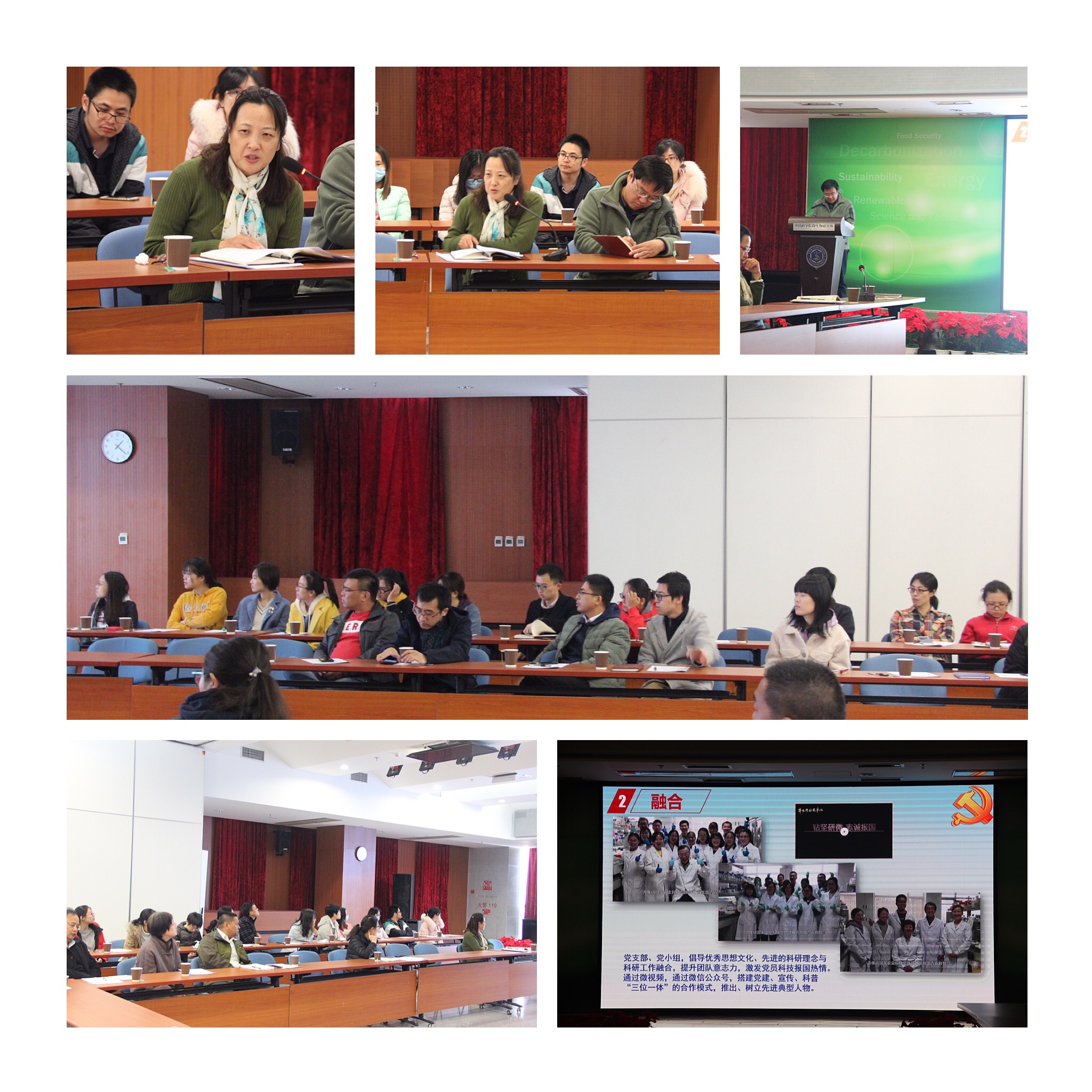 随后,孔照胜书记向支部全体党员进行了“信念引领科研,助力‘农业梦’——支部党建工作与科技创新工作融通融合”2018年度支部工作述职报告。报告从“初心、融合、追梦”三个部分总结了农业室党支部在过去一年中的工作和成果。在“激情燃烧的岁月-不忘初心,重温入党志愿书”主题党日活动中,全体党员回望初心,牢记使命,党和人民利益至上,遵照科学院的办院方针,面向学科发展前沿,面向国家重大需求,把科研成果写在祖国的大地上、农民的笑脸上,承诺一时,践行一生!深入开展“双融双聚”主题实践活动,拍摄了农业室党支部的“率先行动故事汇——钻坚研微 志诚报国”微视频,以方荣祥院士、郭惠珊研究员、仲乃琴高级工程师为代表讲述了农业室的“农业梦”。通过微视频、微信公众号,搭建党建、宣传、科普“三位一体”的合作模式,加强联建共建、促进互相融通。优化基层党支部设置,推进“支部建在实验室”、“党小组建在课题组”,倡导优秀思想文化、先进的科研理念与科研工作融合,提升团队意志力,激发党员科技报国热情,有序推进党支部联建共建、互动提升。