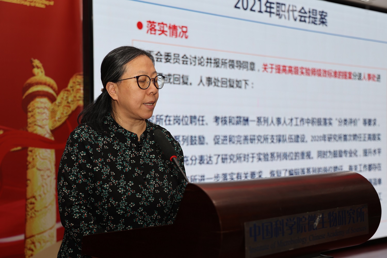 所党委书记王丽萍首先向会议致辞。她代表研究所党政班子,对职代会的顺利召开表示祝贺。她指出,职工代表大会是研究所实行民主管理的基本形式,是职工行使民主管理权力的机构,在法律规定的范围内行使职权。研究所党委一直以来非常重视职工代表大会的作用,把职工代表大会制度建设纳入党建的总体布局,定期听取职工代表大会工作汇报,指导职工代表大会正确处理国家、研究所和职工之间的利益关系,研究解决突出矛盾和问题。希望各位代表能够站在研究所发展大局的高度,集思广益,积极建言献策,在贯通结合上下功夫、出实招,围绕支撑保障科技创新中心工作,结合我所“十四五”规划和未来一个时期的工作部署,研讨贯彻落实的思路和举措,与研究所一起科学制定政策措施,促进研究所的良性创新发展;也进一步按照定位、定标、定事、定人的要求,更好的履行国家战略科技力量主力军的职责使命。