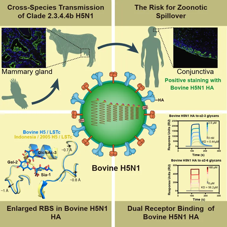 Focusing on the first H5N1 strain (A/Texas/37/2024) of bovine origin that infected humans, researchers first used surface plasmon resonance (SPR) experiments to detect the HA protein encoded by the virus. The results showed that the bovine H5N1 virus HA preferentially binds to avian α2-3 sialic acid receptors but also has a weak ability to bind to human α2-6 sialic acid receptors. Subsequent immunohistochemical staining revealed that this H5N1 HA protein strongly binds to bovine lung and mammary tissues, consistent with clinical symptoms. In contrast, the HA proteins of common human seasonal influenza viruses (H1N1 and H3N2) could not effectively bind to the corresponding tissues in cattle. Additionally, the bovine H5N1 HA protein significantly binds to human conjunctival, tracheal, lung, and mammary tissues, whereas the HA proteins of H1N1 and H3N2 viruses only significantly bind to human tracheal tissues. This finding provides a strong explanation for the molecular mechanism of bovine H5N1 virus-induced conjunctivitis in humans and reveals its distinct tissue tropism compared to seasonal influenza viruses.