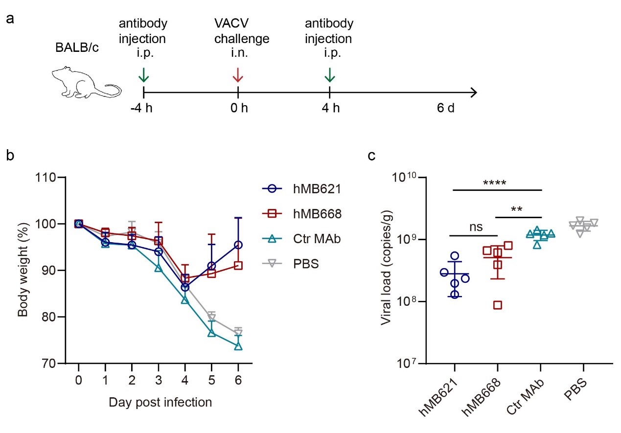 This study first evaluated the pre-existing antibody levels against the MPXV B6 antigen protein in vaccinia vaccine recipients born before the end of the smallpox vaccination program. Then, two monoclonal antibodies, hMB621 and hMB668, were identified and isolated from one of the recipients, targeting different antigenic epitopes on the B6 protein. Binding experiments demonstrated that both monoclonal antibodies exhibited broad binding capabilities to B6 and its homologous proteins in vaccinia virus (VACV), variola virus (VARV), and cowpox virus (CPXV). Neutralization experiments proved that these two antibodies showed potent neutralizing effects against VACV (Figure 1). Animal in vivo antiviral experiments showed that both monoclonal antibodies, administered via intraperitoneal injection, exhibited effective in vivo protection against VACV (Figure 2). Additionally, the study resolved the complex structure of B6 and hMB668, revealing for the first time the structural characteristics of B6 and the binding epitope of the antibody.