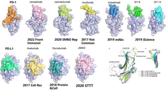 l In 2010,we resolved the molecular structure of PD-L1 (Protein & Cell, 2010). For the first time, the team proposed that the influence of glycosylation modification of the PD-1 molecule should be taken into account for antibody drugs. Systematic researches on the binding characteristics and glycosylation dependence of various antibody drugs were conducted (Nature Communications, 2017; EMBO Reports, 2020; mAbs, 2019; EMBO Reports, 2020). Through the study of the binding epitopes of multiple antibodies, it was found that the FG loop of PD-1 might be a potential immunogenic "hotspot" (iScience, 2019; mAbs, 2019). In cooperation with the team led by Bruno Correia from the University of Geneva, Switzerland, the research team carried out the "de novo design" of PD-1/PD-L1 binding proteins, providing an important basis for the development of new immunotherapeutic drugs (Nature, 2023).