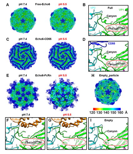To further elucidate the virus-receptor interaction, our team used cryo-electron microscopy (cryo-EM) to resolve seven high-resolution (2.9–3.8 Å) structures of Echo 6 alone and in complex with its attachment receptor CD55 and uncoating receptor FcRn under different pH conditions. The results showed that Echo 6 and its CD55 complex remained stable at both neutral and acidic pH. FcRn binds to the "canyon" structure formed by VP1 on the icosahedral viral surface. Under acidic conditions, FcRn induces conformational changes in the viral surface proteins, leading to the release of lipid molecules ("pocket factors") that stabilize the viral particle. This initiates the uncoating process and genome release.