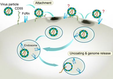Our study revealed that, unlike previously reported attachment receptors for echoviruses (such as CD55), FcRn functions as an uncoating receptor. Upon direct binding to the virus, FcRn, along with lipid membranes, facilitates the essential uncoating process under physiological conditions, ultimately releasing the viral genome into the host cell.