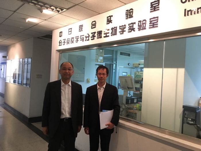 会谈后,钱韦副所长与山梨裕司所长共同参观了中日联合实验室,这也是山梨裕司所长2019年4月上任东京大学医科所所长以来,首次访问微生物所。微生物所科技处杨怀义处长和孙晓晶副处长,东京大学医科所井上純一郎教授,中日联合实验室的合田仁和林光江教授等人也参加了此次会谈。