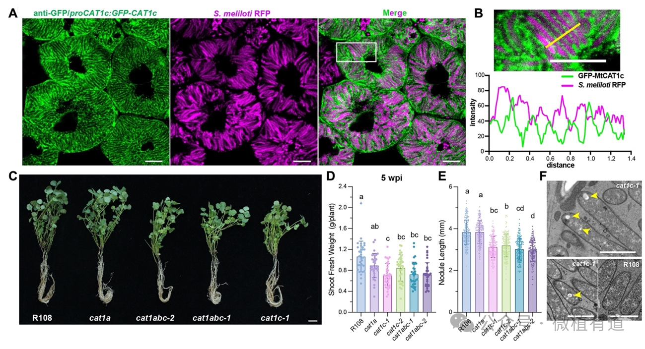图2 共生体膜定位的MtCAT1b和MtCAT1c维持高效共生固氮关系