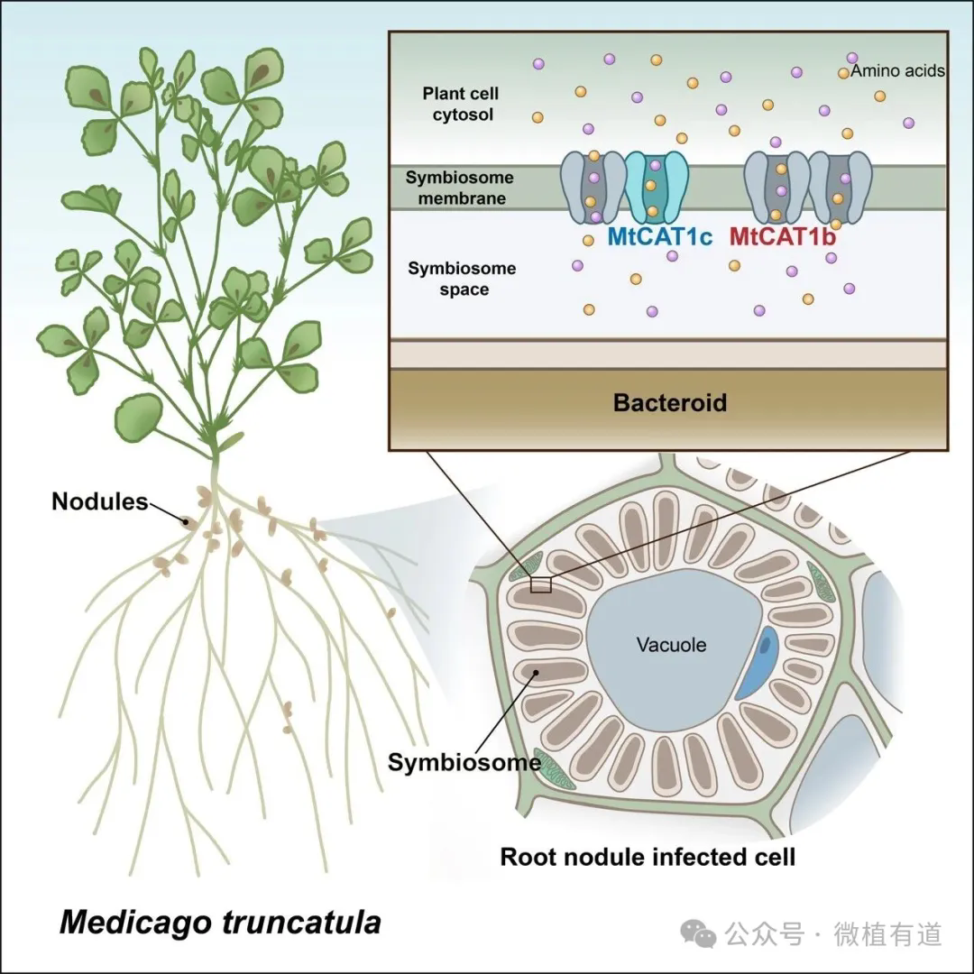图注:MtCAT1b和MtCAT1c在蒺藜苜蓿根瘤侵染细胞中表达,并定位于共生体膜上,参与根瘤菌和豆科植物之间氨基酸交换。Nodules,根瘤;Medicago truncatula,蒺藜苜蓿;symbiosome,共生体;vacuole,液泡;root nodule infected cell,根瘤侵染细胞;bacteroid,类菌体;plant cell cytosol,植物细胞质;symbiosome membrane,共生体膜;symbiosome space,共生体空间;amino acids,氨基酸。(来源:作者)