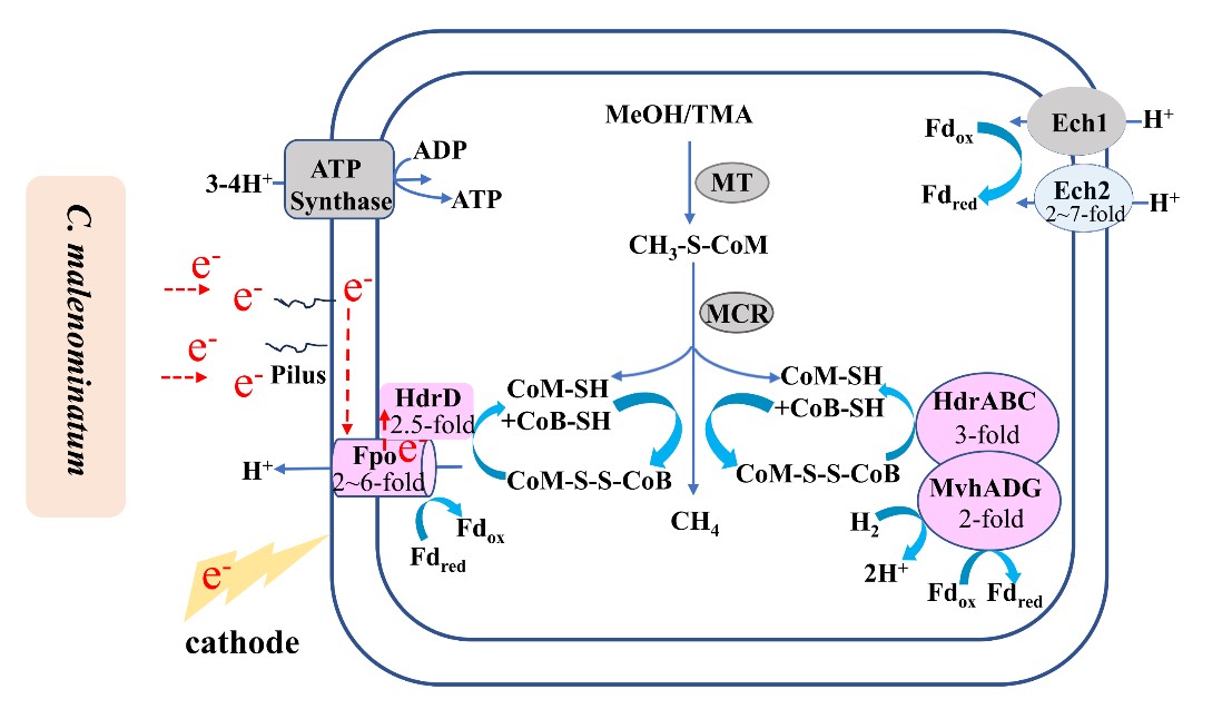 研究发现,从稻田分离的卢米尼甲烷马赛球菌(Methanomassiliicoccus luminyensis)CZDD1 与 恶名梭菌(Clostridium malenominatum)、或已知的释放胞外电子的金属地杆菌(Geobacter metallireducens)共培养,甲醇产甲烷速率比用H2的纯培养物高1.9 倍。甲烷马赛球菌CZDD1和稻田土壤电化学培养物,均消耗电流从甲醇和二甲基砷产生甲烷,因此证明稻田中存在基于胞外电子转移的甲基产甲烷过程。转录组分析表明,甲烷马赛球菌CZDD1可能通过膜结合的Fpo蛋白复合物摄取胞外电子,并用于甲基物质还原产甲烷。研究在五个中国稻田样本中发现甲烷马赛球菌科与地杆菌和梭菌科的共存现象,因此,推测基于DIET的甲基产甲烷途径或广泛存在于稻田生态系统。