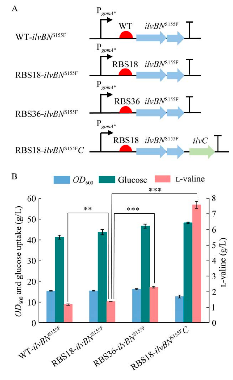 为了提高谷氨酸棒杆菌的支链氨基酸生产,研究团队开发了靶基因精细调控元件的系统筛选与表征体系。通过对启动子和核糖体结合位点(ribosomebinding site,RBS)的改造,研究者们成功筛选出了多种高效表达调控元件。例如,经过筛选,PgpmA*启动子的表达强度可达天然启动子的23.3倍,而通过进一步的RBS文库筛选,还获得了62.3倍表达强度的突变体。这种精细的调控策略不仅可以应用于AHAS高效调控,也可为其他关键酶的表达调控提供方法借鉴。通过应用不同强度的调控元件,研究者们发现L-缬氨酸的产量可以随着表达强度的增强而逐步提高。