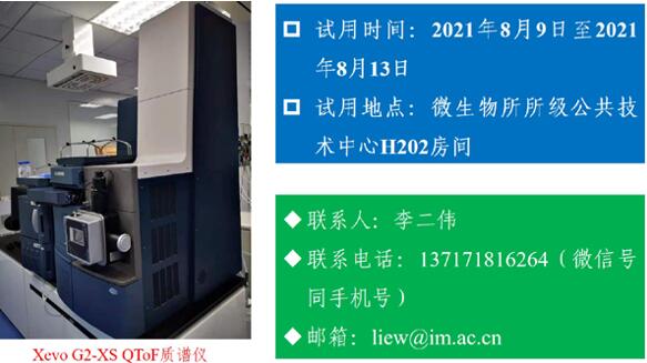所级中心将举办超高效液相色谱高分辨质谱联用仪UPLC I-Class Plus/Xevo G2-XS QToF试用活动。欢迎大家积极使用,并欢迎就仪器使用反馈宝贵意见。