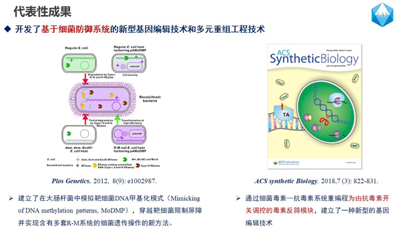 系统建立了微生物的高效基因组编辑新技术,创建微生物菌种改造与创新平台。首次提出了“DNA甲基化模式模拟“(MoDMP)”的科学概念,通过模拟顽固细菌DNA甲基化模式,穿越其限制修饰屏障,在多个难转化工业微生物菌种中实现了遗传操作。建立了限制性修饰系统介导、毒素-抗毒素反筛模块控制和CRISPR-Cas9系统介导的新基因组编辑技术和多元重组工程技术,提高了菌种遗传改造效率。建立大肠杆菌、芽胞杆菌、谷氨酸棒杆菌及酵母菌的高效基因组编辑方法,构建新型的合成生物学元件库,设计适用于工业生产的代谢调控开关,进行代谢网络的精细动态调控。