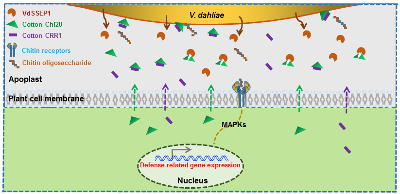 图:棉花CRR1、Chi28与大丽轮枝菌VdSSEP1在棉花根质外体免疫中的相互作用模型