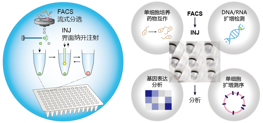 单细胞分析是一项变革性技术,在单细胞基因组异质性研究及复杂微生物群落中稀有微生物种群多样性研究等领域应用广泛。然而,如何进一步降低单细胞分析的成本,提高可靠性和效率,仍然面临重大挑战。流式细胞荧光激活细胞分选(FACS)是目前最高效的单细胞分选技术,可实现病毒、细菌、真菌和动物细胞的多参数检测和分选;利用荧光标记,可对不同类型的细胞进行有效的区分,分选成功率高。研究团队将INJ与FACS平台相结合,建立了FACS-INJ单细胞分选分析流程,应用覆盖了单细胞表型分析、基因型分析、基因表达分析以及全基因组扩增测序。