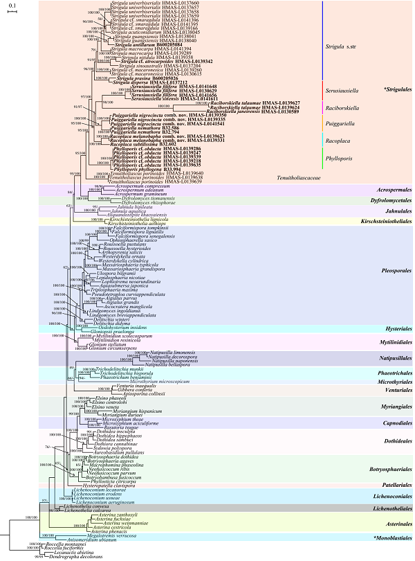 图1. 基于SSU, LSU, TEF1-α和RPB2基因的座囊菌纲系统发育树