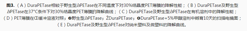 随后,作者对DuraPETase蛋白晶体结构进行解析(图4),验证了突变体活性位点区域氨基酸之间协同相互作用,探究了DuraPETase性能改善的分子机制。值得注意的是,该项研究实现了2 g/L微塑料在温和条件下的完全降解,为废水中微塑料的预处理提供新的处理思路。