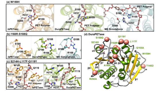 图4.(a)W159H,(b)I168R-S188Q,及(c)S214H-L117F-Q119Y突变的结构分析,黄色、绿色、蓝色分别代表野生型IsPETase,DuraPETase晶体结构及DuraPETase的分子动力学模拟轨迹构象