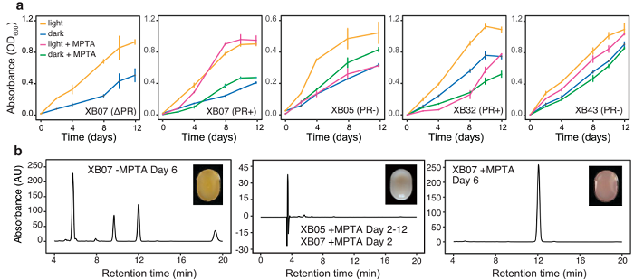 在中科院微生物所东秀珠研究员带领下,开展了对47株冰川黄杆菌 (Flavobacterium) 的多组学研究,基因组分析发现其中37株含有变形菌视紫红质 (proteorhodopsin, PR) 基因,另外10株不含PR基因。PR蛋白是光驱动的跨膜质子泵,偶联一个视黄醛分子,能够接受光能,将质子从胞内泵到胞外,在细胞膜两侧形成电势能梯度,将光能转变为ATP。目前,国际上普遍认为PR决定了黄杆菌的光促生长表型。然而,光照生长实验发现无论是携带PR基因、缺失PR基因以及人工构建的PR缺失株,冰川黄杆菌均表现出光促生长特性。通过比较基因组学、转录组和表型实验等分析发现,在低氧、寡营养等状态下,冰川黄杆菌的光促生长表型与玉米黄质等色素合成相关,含玉米黄质、番茄红素等β-类胡萝卜素的冰川黄杆菌可以为其提供光保护、维持低温下细胞膜功能等作用,而仅含有黄色素的冰川黄杆菌无法在光照条件下生长。该研究发现了PR可能并非国际上一直以来普遍认为的光促生长关键基因,可能存在新的光/氧调控机制。高山冰川一般位于高海拔地区,表层光照辐射强度大,冰川表层存在可以利用光能的细菌、蓝细菌及藻类等。该研究首次发现,冰川表层优势的非光合细菌在低氧、光照条件下生长速率显著提高,揭示了光照对冰川表层生态系统具有非常重要的影响,发现玉米黄质等色素在冰川环境重要的生态意义,可能影响了黄杆菌在冰川表层环境的适应和种群扩散。