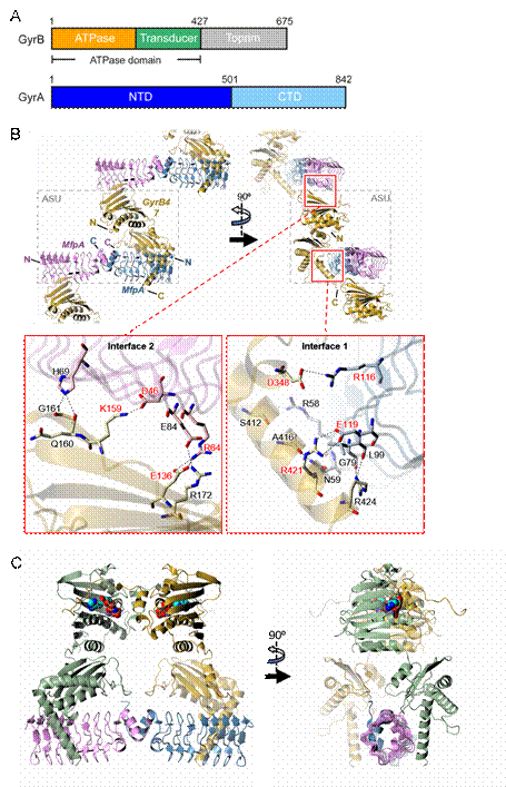 通过X射线晶体学,解析了MfpA与DNA旋转酶ATPase结构域的复合体(图2)。