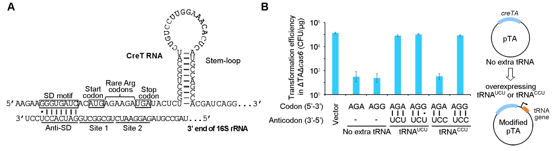 对CreT RNA的精细序列和结构分析表明,其5'端具有强效的翻译信号SD(Shine-Dalgarno)序列和AUG起始密码,紧接其后的是两个精氨酸稀有密码子AGA, 随后是终止密码子UGA和一个茎环结构(图3A)。系列突变实验表明,上述关键序列和结构都是CreT毒性所必需。基于此,该团队推断了一个全新的分子回路,即CreT RNA借助强效的翻译起始信号定位在核糖体上,然后通过两个串联的稀有密码子AGA进一步劫持胞内稀有的精氨酸tRNAUCU,从而抑制了胞内其它重要蛋白的翻译合成和细胞生长。基于这一猜想,他们通过过表达tRNAUCU成功解除了CreT的细胞毒性(图3B),证实了这一全新的毒性机制,即CreT 是通过其RNA劫持胞内稀有的精氨酸tRNA发挥毒性,而非翻译产生含二精氨酸的小肽发挥作用,因此CreT是一类小RNA毒素。