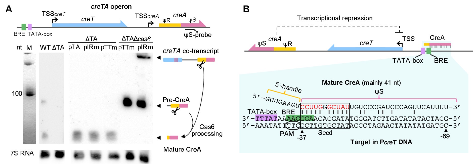 为揭示Cascade蛋白抑制CreT毒性的分子机制,该团队首先敲除了胞内唯一的CRISPR array结构,从而排除了CRISPR array来源的crRNA参与毒性抑制的可能性。对311bp基因间区的截短与突变实验表明,creT下游序列为毒性抑制所必需(图2C)。精细的序列分析和Northern印迹等实验表明,creT下游有一段与CRISPR repeat高度相似的序列(图2A),该序列及其下游序列可独立转录产生一个约90nt的前体RNA,并被Cas6加工为一个的成熟的小RNA(图4A)。该小RNA约41nt,含有与crRNA一样的完整的5' handle序列(8 nt),特定的spacer序列(约33nt),但缺乏crRNA常见的3' handle,因此命名为“类crRNA抗毒素”(CrRNA-resembling Antitoxin),简称CreA。CreA作为crRNA类似分子,即可能联合Cascade蛋白对CreT毒素活性发挥抑制作用。