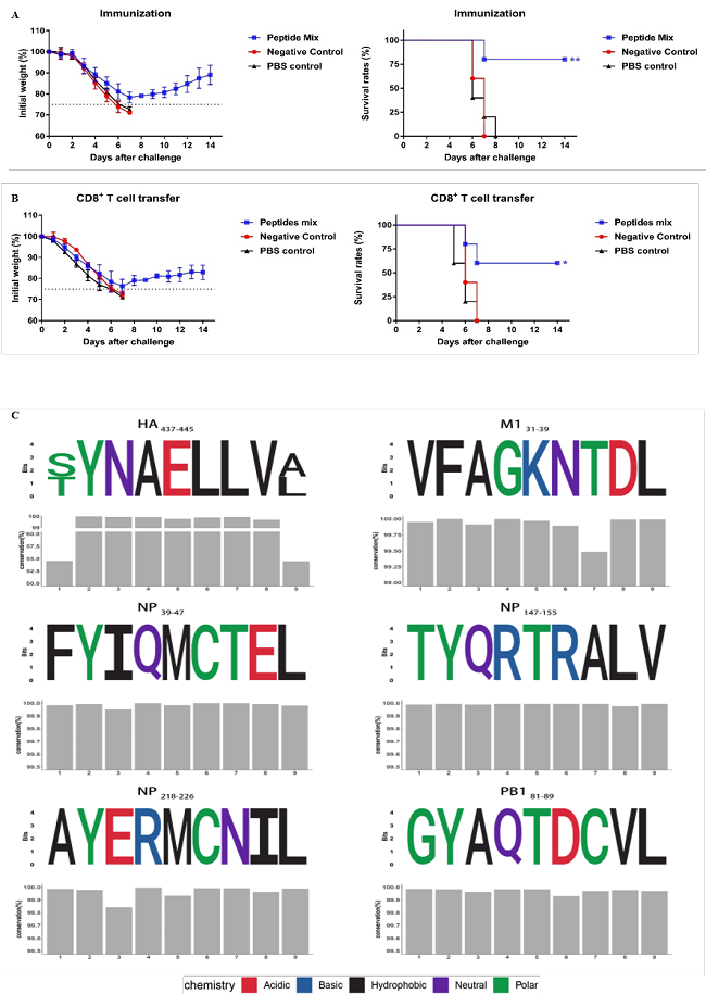 图例: 6个流感病毒保护性保守T细胞表位可引发对不同毒株的交叉免疫保护(A和B),以及在不同毒株中的序列比对结果(C)。