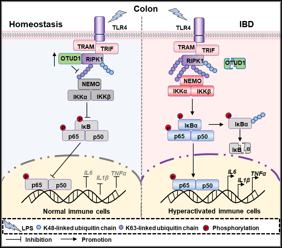 综上,该研究揭示了去泛素化酶OTUD1通过去除RIPK1K63多聚泛素链而抑制肠道免疫细胞中NF-κB通路介导的促炎细胞因子的产生进而抑制肠炎发生的分子机制,表明以OTUD1-RIPK1信号轴为靶点的免疫干预可能是治疗IBD的有效途径,该研究为肠道炎症性疾病的防治提供了潜在的干预新靶点。