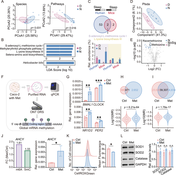 该研究首先确定了人类和小鼠肠道菌群中具有相同昼夜模式的重要代谢途径(S-腺-L-甲硫氨酸循环Ⅰ),然后调查了参与该代谢途径的重要昼夜差异代谢产物(甲硫氨酸)对宿主的可能影响,即甲硫氨酸具有调节宿主肠道核心时钟基因表达和活性氧(ROS)水平的双重作用。此外,该研究也发现饮食甲硫氨酸补充可以缓解睡眠剥夺引起的代谢紊乱、炎症和肠道菌群失调。该研究为肠道菌群衍生的甲硫氨酸的潜在作用提供了证据和机理上的见解,特别是其在调节宿主代谢方面的潜在应用。