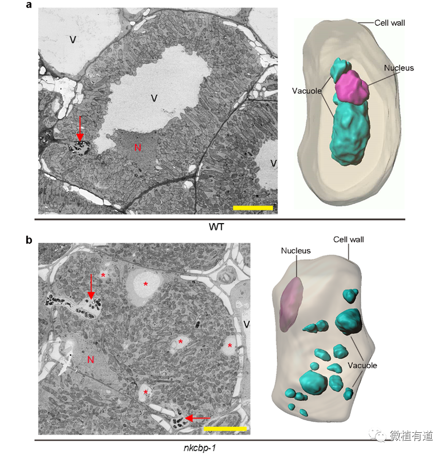 KCBP(Kinesin-like Calmodulin-Binding Protein)是植物特有的微管马达蛋白,具有同时结合微管和微丝的能力,调控细胞骨架动态重构和细胞形态建成。KCBP基因在豆科植物中特异发生基因加倍,并且演化出根瘤中富集表达的拷贝nKCBP来调控结瘤固氮。利用基因编辑技术获得了蒺藜苜蓿(Medicago truncatula)nkcbp突变体,表现出生长缺陷(图1a)和固氮能力显著下降(图1b)。进一步对根瘤的半薄切片、超薄切片进行观察发现,野生型根瘤的侵染细胞具有典型的中央大液泡(图1c和2a),而nkcbp突变体则含有大量随机分布的未融合小液泡(图1d和2b),甚至有些侵染细胞内共生体不能分化、共生体膜加厚。运用连续超薄切片扫描电镜成像(Automatic collector of ultrathin sections scanning electron microscopy, AutoCUTS-SEM)技术,对野生型和突变体液泡结构进行了三维重构(图2)。结合活细胞成像和免疫荧光染色,证实了nKCBP具有保守的生化功能,同时结合微管和微丝。进一步发现,与野生型相比,nkcbp突变体侵染细胞中细胞骨架辐射状排布被破坏而呈现随机、无序的排布模式。综上所述,nKCBP通过调节细胞骨架动态重构来调控液泡发生和共生界面形成(图3),从而控制根瘤菌内共生与高效固氮。