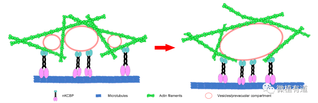 图3:nKCBP通过调节细胞骨架动态重构来调控液泡发生和共生界面形成,从而控制根瘤菌内共生与高效固氮的工作模型