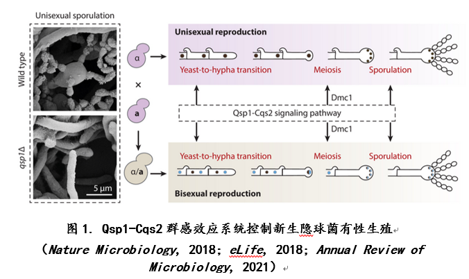 隐球菌科真菌是引起真菌脑膜炎的主要病原体类群,每年导致数十万人死亡,在我国其感染病死率超过30%。有性繁殖【包括双性生殖(bisex)和α同性生殖(α unisex)】促进了该病原体类群的感染、毒力进化和耐药变体的产生。其中,α同性生殖为隐球菌病原体特有繁殖策略,其通过创建遗传物质和核型多样化,促进了高毒菌株产生,造成北美严重的隐球菌暴发性感染。研究团队前期工作揭示了驱动隐球菌有性生殖分化的重要信号分子和分子细胞机制,为本研究开展奠定了基础。