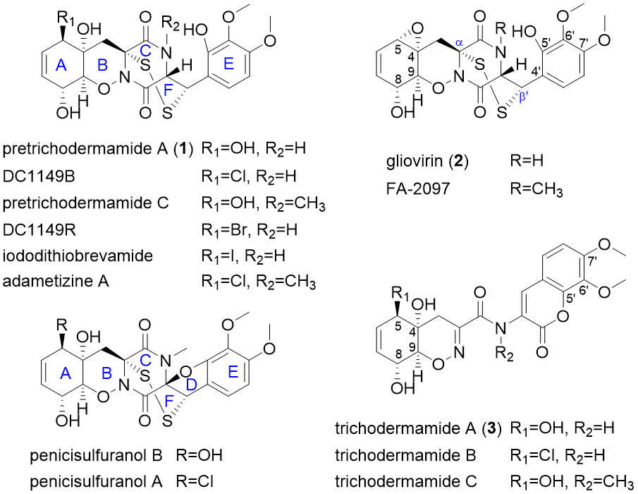 ETPs是一类由真菌产生的次级代谢产物,其中一个亚类pretrichodermamides含有独特的α, b'-二硫桥、1, 2-噁嗪环和复杂的多环结构(A–F环,图1),复杂的结构加大了其有机合成的难度,严重制约了pretrichodermamide的药用开发。因此,研究pretrichodermamides的生物合成途径是理解该类次级代谢产物结构复杂性和多样性的关键手段。