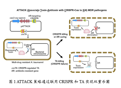CRISPR-Cas系统是细菌和古菌中广泛存在的一种适应性免疫系统,能够精准切割噬菌体的特定DNA序列。科学家已将CRISPR-Cas系统发展成为特异性的新型杀菌剂,精准消杀携带耐药基因的多重耐药细菌,有望成为对抗细菌耐药的下一代杀菌剂。然而,快速进化的细菌仍然可以通过多种途径获得对CRISPR杀菌剂的抗性,例如,通过表达Anti-CRISPR蛋白失活Cas核酸酶,或通过基因组重排或转座事件破坏它们的编码基因。2021年,微生物研究所在Science上率先报道一类可以护卫CRISPR-Cas的双RNA型毒素-抗毒素系统——CreTA(CRISPR-regulated toxin-antitoxin)(Science 372, eabe5601)。这些新型TA元件潜伏在CRISPR-Cas系统内部,并受后者的调控,一旦CRISPR-Cas被破坏将释放毒素的表达杀死菌体,可使细菌对CRISPR-Cas元件“成瘾”。正是利用CreTA的这一功能特性,研究团队将其内置于CRISPR杀菌剂中,从而巧妙地使靶标耐药细菌陷入两难:如果CRISPR杀菌剂保持其元件活性,它将切割靶标耐药基因,并导致菌体死亡;而一旦细菌利用各种anti-CRISPR机制将CRISPR-Cas元件失活,CreTA将释放毒素表达杀死菌体(图1)。这一ATTACK策略显著提高了CRISPR杀菌剂的元件稳定性和杀菌效率。