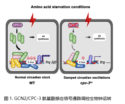 正常情况下,生物体的生物钟始终处于一个相对稳定的状态,从而保证生物体生命活动有条不紊的进行。氨基酸是重要的小分子代谢物和信号分子,氨基酸含量及其代谢信号通路是否调控生物钟系统?研究发现GCN2/CPC-3信号通路感受氨基酸饥饿压力胁迫,诱导转录因子CPC-1大量表达,通过募集组蛋白乙酰转移酶GCN-5升高生物钟核心基因frq的乙酰化修饰,进而促进转录因子WCC节律性激活frq基因的转录,维持生物钟的运转和相关代谢基因的节律性表达。研究揭示了氨基酸代谢与生物钟相互调控对于维持细胞内稳态的重要性,将促进我们理解不同物种代谢稳态和生物钟稳定性的调控机理。