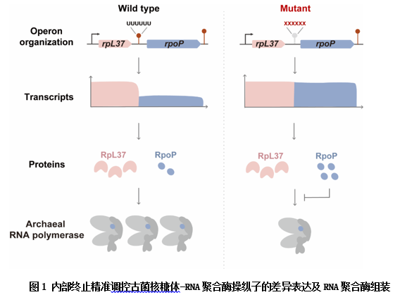 古菌是与细菌和真核生物相并列的第三种生命形式,是生物圈边界的界定者,因此提供了发现新生命现象、机制及技术创新的独特路径;但目前对古菌必需生命过程——转录过程及机制还所知较少,限制了对古菌的开发利用。该团队在前期有关古菌转录终止的研究基础(Nucleic Acids Res,2020;elife,2021; Microbiology Spectrum,2021)上,通过建立新的全长转录组测序技术,并整合dRNA-seq,Term-seq及Illumina RNA-seq,在单碱基水平确定了模式甲烷古菌的操纵子组成;发现组学水平的操纵子内部转录终止现象,揭示内部终止同样依赖终止因子aCPSF1和终止子U-tract。进一步研究发现,内部终止可能决定操纵子内基因的阶梯差异表达;利用新建立的CRISPR-Cas9编辑工具(Microbiology Spectrum, 2022)突变部分操纵子中的内部终止子后,证明内部终止精准调控包括核糖体-RNA聚合酶亚基等操纵子基因的差异转录及其精准剂量比;破坏该调控后,发现导致下游的RNA聚合酶亚基转录上调,但却导致菌体的生长显著下降,且转录速率、翻译速率下降,并发现导致组装的RNA聚合酶复合物显著降低;由此证明了操纵子内部终止是一种重要的新转录调控模式,其通过精准控制操纵子内功能基因的差异表达,调控着细胞生理所需的重要功能基因,包括核糖体亚基-RNA聚合酶亚基等的精准表达及剂量比,以保证菌体的最适生理和生长。此外,通过生信分析发现核糖体-RNA聚合酶亚基同源基因操纵子普遍存在于古菌各进化分支的物种中,且代表性古菌的转录组数据提示了类似的差异表达现象,表明操纵子内部终止机制可能是古菌物种中普遍采用的一种新转录调控模式。
