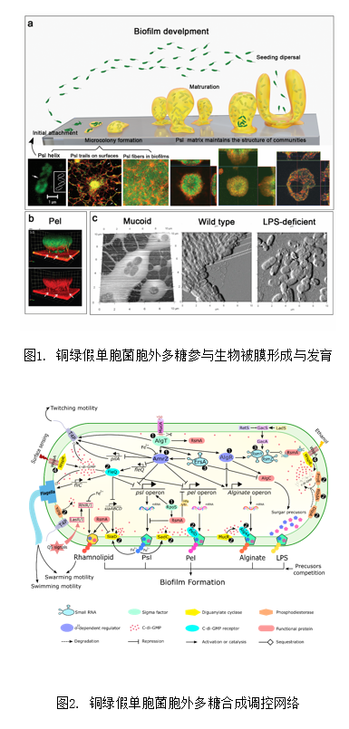 铜绿假单胞菌是生物被膜研究的模式菌株之一,可在免疫缺陷患者体内或囊性纤维化患者肺部,或在插管导管、伤口、隐形眼镜等表面形成生物被膜。细菌通过合成大量多糖促进生物被膜的形成,有利于菌体在不同环境中适应和生存。铜绿假单胞菌可以形成多种胞外多糖,包括Psl、Pel、Alginate和脂多糖等。这些多糖在生物被膜的形成过程中发挥着至关重要的作用。