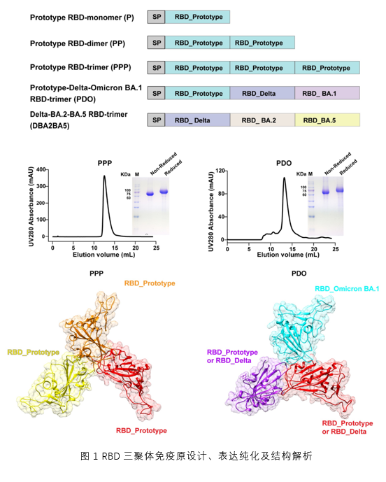 前期,高福院士团队领导设计了 冠状病毒高免疫原性的串联重复受体结合结构域(RBD)二聚体蛋白(Dai,2020),并基于该设计理念开发了新冠疫苗ZF2001。为应对新冠病毒变异株的流行,团队将免疫原进一步改造,设计了嵌合RBD异型二聚体蛋白(Xu,2022),以诱导广谱免疫反应,目前开发的疫苗已经进入了临床实验。