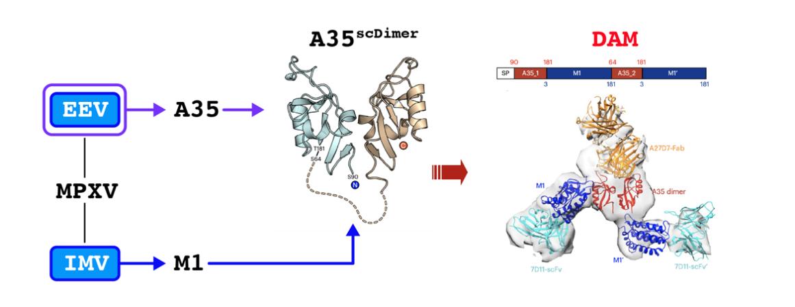 团队首先对猴痘病毒两种感染性病毒粒子的关键抗原做免疫原性评估,发现抗原A35颈部区是其免疫原性强弱的决定性因素。为了在提高A35免疫原性并稳定其中和表位的同时,获得更加均一的A35抗原,团队利用颈部区序列对A35进行单肽链二聚化改造,并将2个抗原M1与单链A35二聚体做单肽链嵌合改造,设计出了兼顾两种感染性病毒粒子的全新猴痘单一免疫原DAM(Double A35 and M1)。