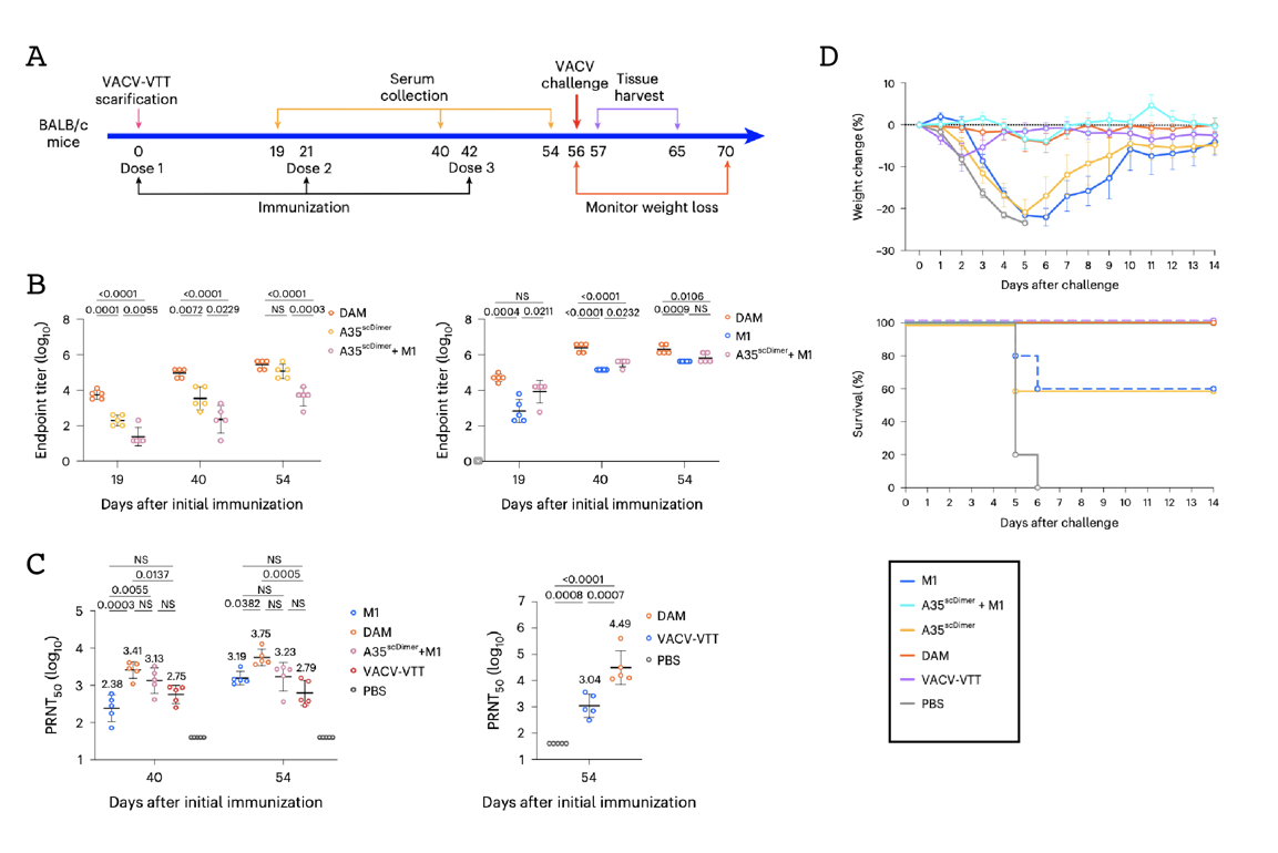 小鼠模型中发现DAM具有极好的免疫原性,其激发的M1和A35特异性抗体水平均高于两种抗原混合免疫;其激发的猴痘病毒中和抗体水平是传统的活病毒疫苗的28倍,并实现了对致死剂量痘苗病毒感染小鼠的完全保护。