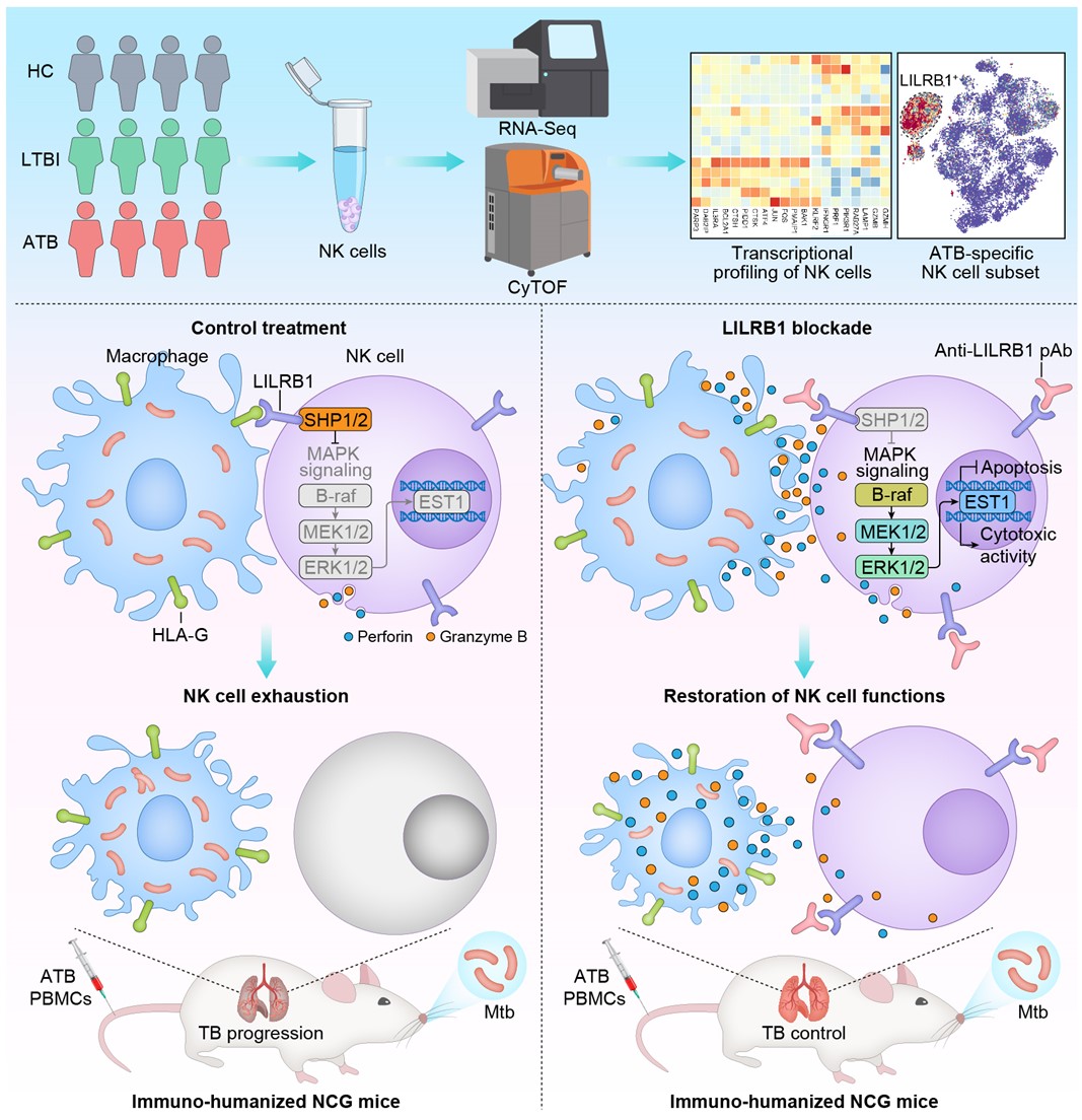 近日,中国科学院微生物研究所刘翠华团队联合汪静研究员、高福院士及首都医科大学逄宇教授共同揭示了结核病(tuberculosis,TB)的病原菌——结核分枝杆菌(M. tuberculosis,Mtb)慢性感染过程中由LILRB1–HLA-G信号轴驱动的自然杀伤(natural killer,NK)细胞免疫耗竭(immune exhaustion)的表型特征与调控机制,相关研究以“LILRB1–HLA-G axis defines a checkpoint driving natural killer cell exhaustion in tuberculosis”为题发表于EMBO Molecular Medicine。