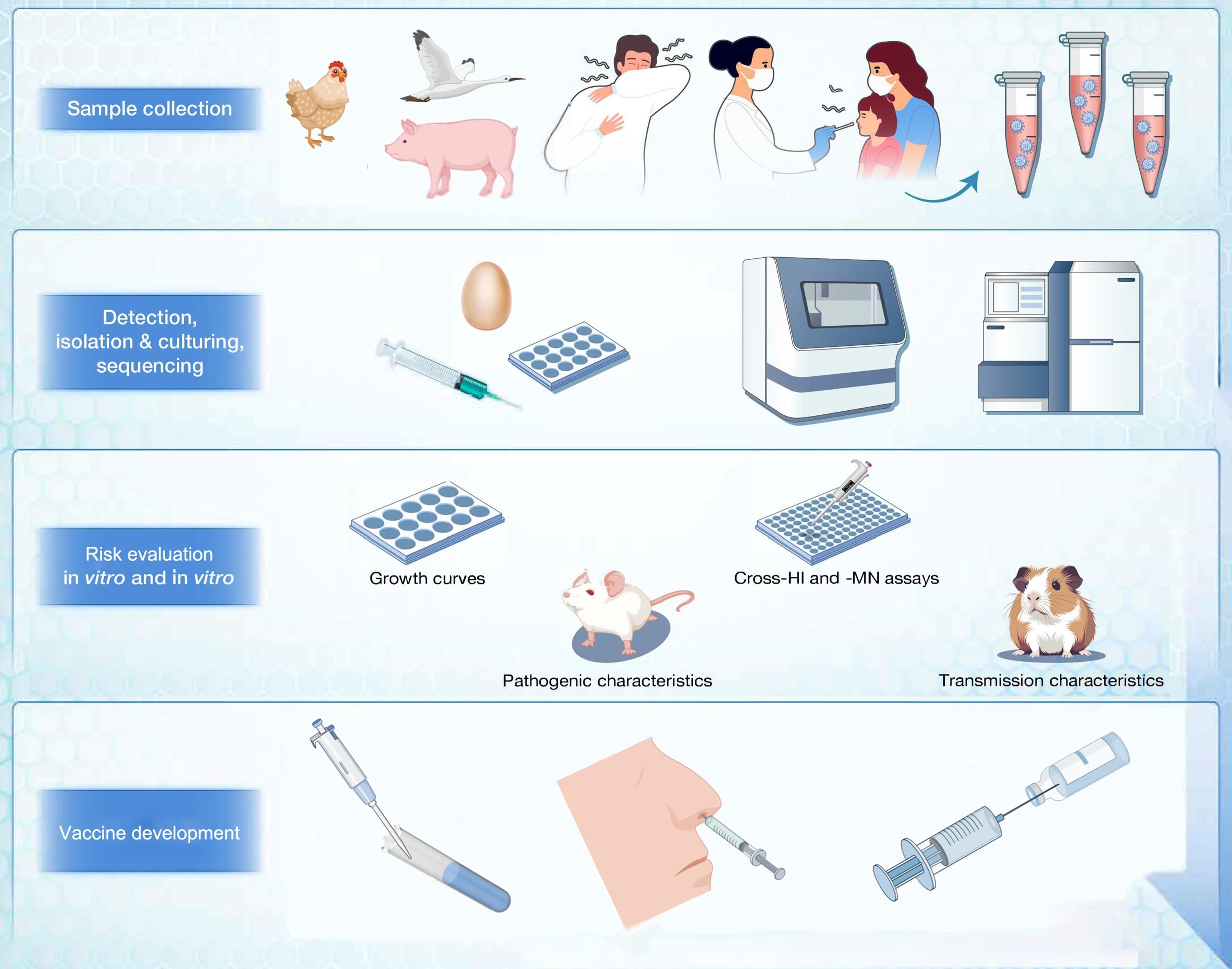 图1. 针对突发新发呼吸道病毒的监测预警、风险评估及疫苗毒株筛选构建的研究思路