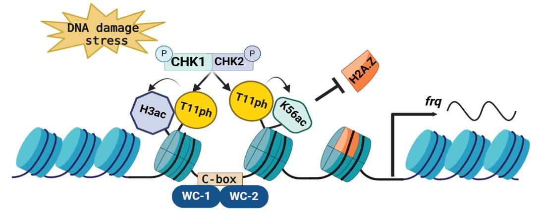 生物钟帮助生物适应昼夜交替引发的光照、温度及营养等环境变化。生物钟与细胞周期以及DNA损伤修复之间的互作对于维持细胞内稳态具有重要作用,然而DNA损伤如何调控生物钟的运行仍不清楚。该研究发现检查点激酶CHK1和CHK2响应DNA损伤,通过与转录因子WCC互作被招募至生物钟核心基因frq启动子,促进该区域组蛋白H3T11的磷酸化修饰和H3K56的乙酰化修饰,阻遏组蛋白变体H2A.Z在染色质上的沉积,继而促进WCC节律性激活frq基因的表达,维持DNA损伤时生物钟的正常运转。研究解析了检查点激酶介导的生物钟应答DNA损伤的调控机制,揭示了DNA损伤修复与生物钟相互调控对于维持细胞内稳态的重要性,将促进我们理解生物钟与细胞周期及DNA损伤修复之间互作关系。