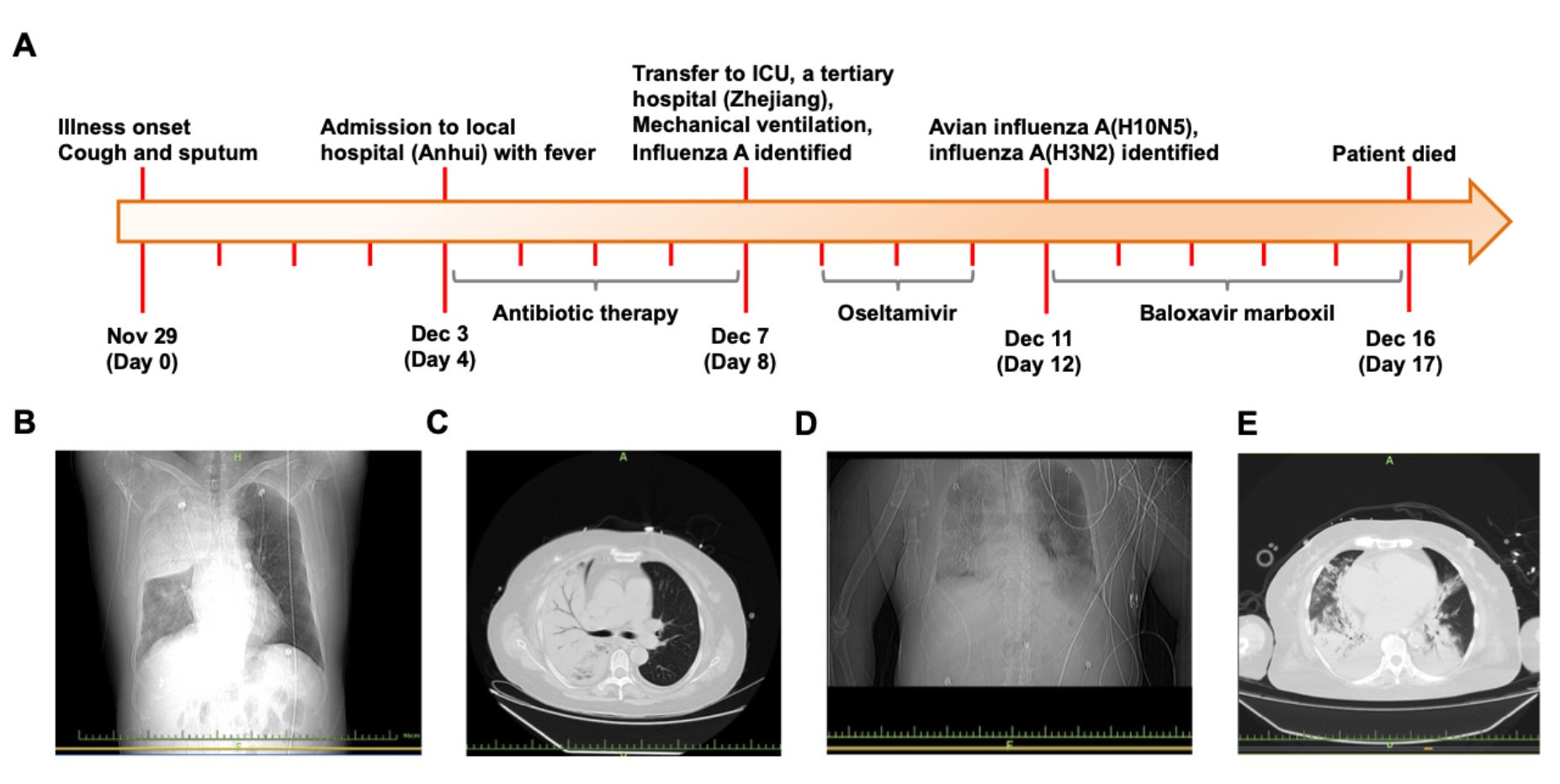 图1. 全球首例人感染H10N5禽流感病毒患者临床病程和救治