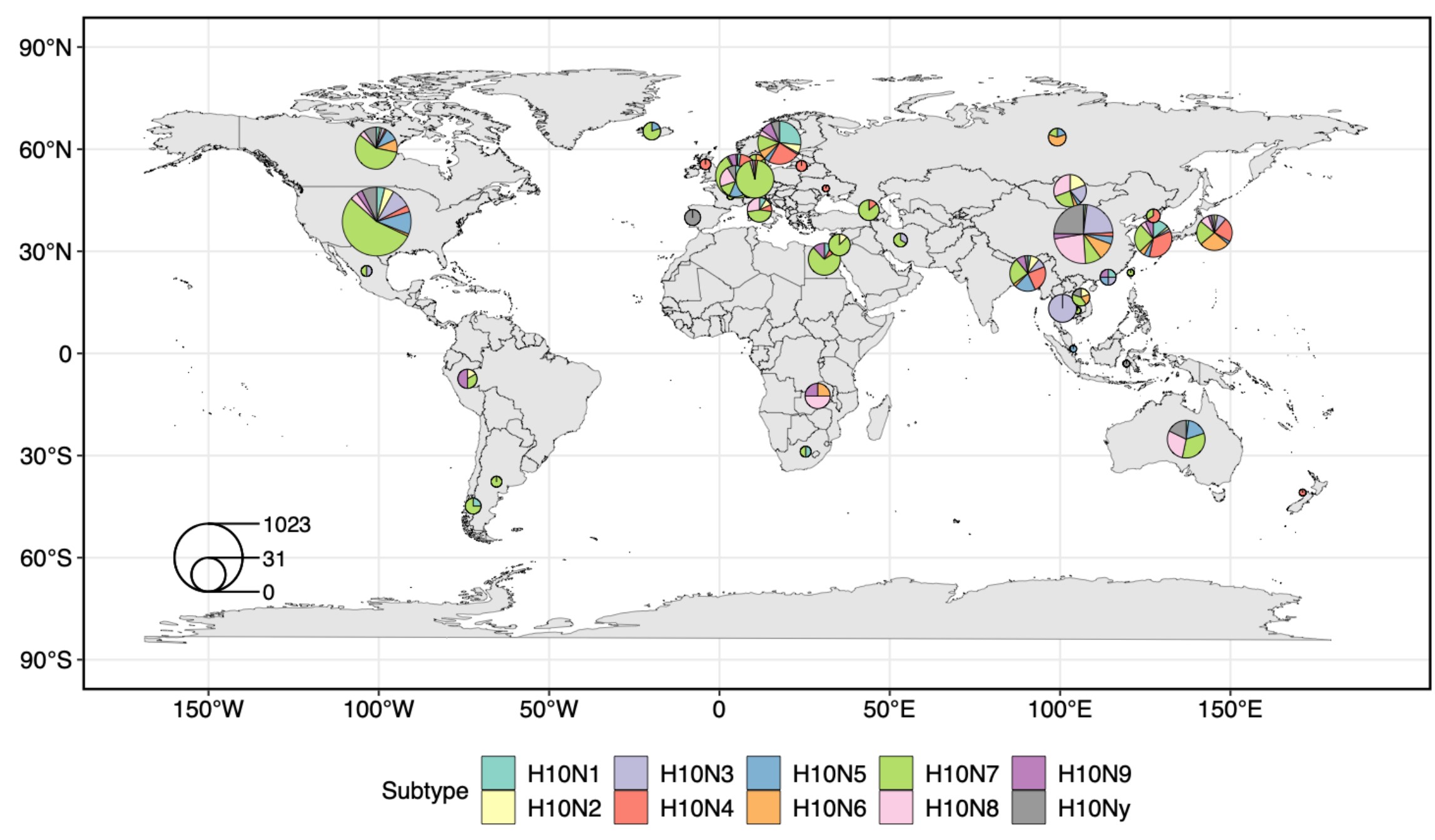 图2. H10Ny亚型禽流感病毒全球分布及潜在风险