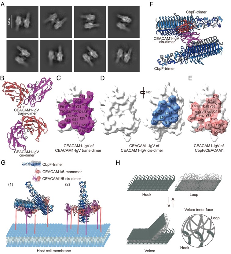 研究团队运用冷冻电镜技术,解析了CbpF分别与受体CEACAM1和CEACAM5结合的高分辨率结构。在复合物结构中,CbpF以三聚体形式组装,形成对称的3:3结合模式。此外,还观察到两个CbpF三聚体与一个处于二聚体状态的受体分子相结合的复合物颗粒(图1)。基于这一发现,团队提出了“粘扣(Velcro)”模型,即高度灵活的CbpF蛋白充当“毛面(loop)”,通过多结合位点与宿主受体“钩面(hook)”相互作用,从而建立起紧密黏附。该机制可能使细菌能够在机械应力作用下灵活调节黏附强度,即在需要时牢牢黏附,在必要时轻松脱离来适应复杂的生理环境。