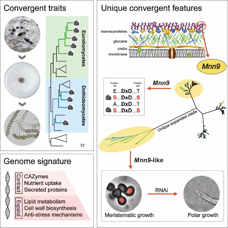 本研究通过对座囊菌纲和散囊菌纲中典型石生真菌物种及其近缘非石生真菌物种开展比较基因组学分析,发现石生真菌普遍具有基因组较小、重复序列少、基因密度高等特征;与腐生生活相关的基因数量显著减少,而与抗逆性相关基因明显扩张;染色质重塑和蛋白折叠相关基因受到正选择作用。尤为重要的是,参与细胞壁生物合成的甘露糖基转移酶表现出显著的分子趋同信号。通过RNA干扰实验证实,石生真菌中特异性扩张的Mnn9-like基因不仅参与细胞壁糖蛋白合成,还调控石生真菌典型的分生组织生长方式,从而增强其对逆境的适应能力。