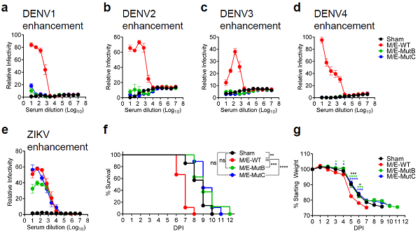 图3. MutB/C疫苗消除了对登革病毒感染的体外和体内AD