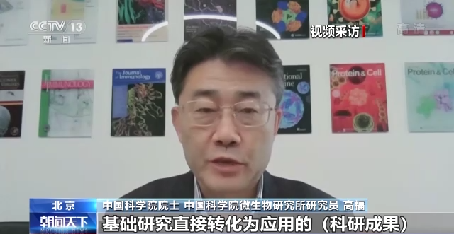中国科学院院士 中国科学院微生物研究所研究员 高福:从科学发现、基础研究、技术开发,一直到产品,可以做到零距离。我们全世界第一个(新冠病毒重组)蛋白亚单位疫苗,就是一个典型的基础研究直接转化为应用的(科研成果)。