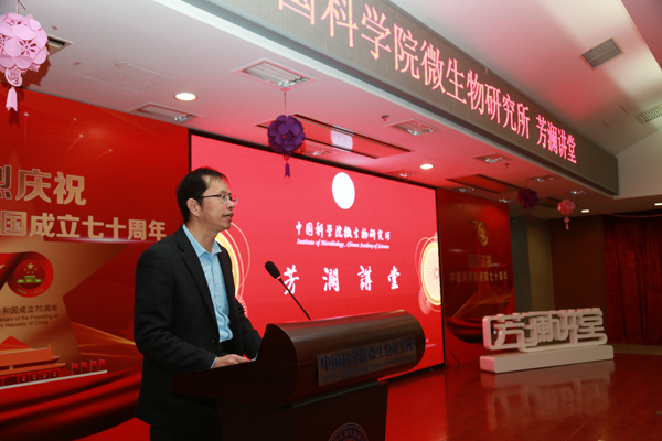 副所长钱韦致辞。他总结了戴芳澜先生一生的科研轨迹,阐释了“芳澜讲堂”所以冠名“芳澜”,正是要在后学中弘扬微生物所创始人、首任所长戴芳澜先生为代表的老一辈科学家精神,即胸怀祖国、服务人民的爱国精神,勇攀高峰、敢为人先的创新精神,追求真理、严谨治学的求实精神,淡泊名利、潜心研究的奉献精神等。他表示,“芳澜讲堂”将永久性举办下去,它在研究所创新文化建设中独树一帜,倡导科学家追求真理、勇攀高峰,同时保有人格的高洁,也即致力于培育和弘扬科学家精神和科学精神。