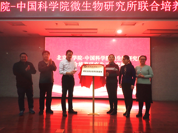 钱韦所长在致辞中对北京农学院参会领导和老师的到来表示欢迎。多年以来,双方在北京市实培计划、联合培养研究生和研究平台共享等领域的合作正不断深化,期待双方能够实现长期合作,取得更丰硕的成果。尚巧霞副院长对微生物所在本科生实培计划和研究生科研实践工作中的支持表示了感谢,并希望双方发挥师资队伍和学科特色等优势,继续加强交流,实现合作共赢。钱韦所长和尚巧霞副院长共同为“北京农学院研究生联合培养实践基地”进行了揭牌,标志着双方在农业微生物相关领域的合作进入新的阶段。