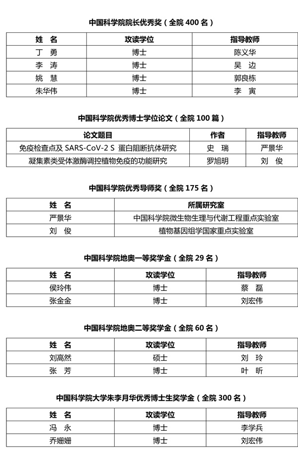 2021年度中国科学院院长奖、中国科学院优秀博士学位论文、中国科学院优秀导师奖、中国科学院地奥奖学金、中国科学院大学朱李月华优秀博士生奖学金已揭晓。中国科学院微生物研究所以下研究生及导师获得相应荣誉,特此祝贺!