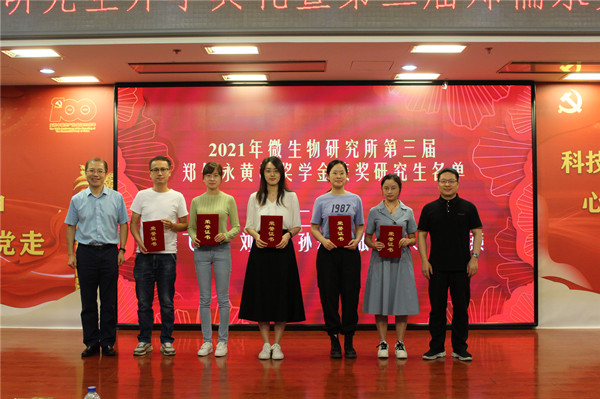随后,研究所对获得第三届郑儒永黄河奖学金的11名研究生进行了表彰。钱韦、李俊雄、石硕、向华、杨永峰等五位所领导共同为获奖学生颁发了证书并合影留念。获奖学生代表高敏对郑儒永院士和黄河研究员两位老先生不忘初心、心怀家国的精神表达了崇高的敬意,对微生物所卓越的实验平台、导师的悉心指导和其他老师的关心帮助表示了感谢,她还鼓励新同学在学习和科研工作时要专注和坚持,学会深入思考,积极乐观不放弃。
